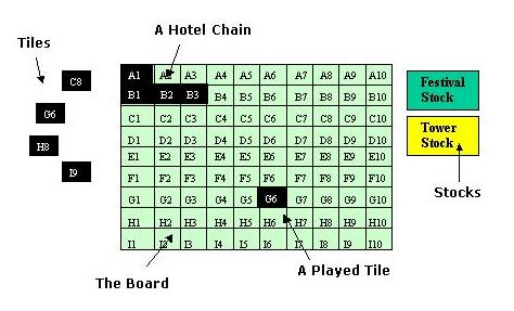Because Acquire is not as popular or well-known a game as, say, Monopoly, we have included here the rules of the game. The following is a picture illustrating the layout of the board: