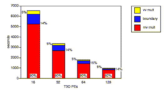 Figure 13 breaks down the performance from a different angle: how much time is spent performing vector-vector sums and products (5%), computing boundary conditions (15%), and performing global sparse matrix vector product operations (80%). Clearly, the sparse matrix vector product operations dominate the running time.