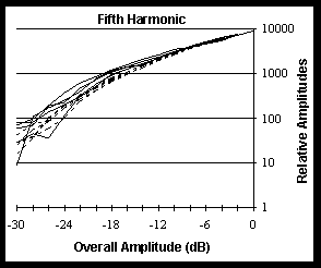 In Figure 1 we show examples of the resulting graphs. These show the first, fifth and tenth harmonics from ten measurements; five from crescendos and five from decrescendos. These graphs show that, at high amplitudes, there is indeed a direct relationship between RMS amplitude and the amplitude of a given harmonic. The relationship appears to be independent of whether amplitude is increasing or decreasing; otherwise, there would be a separation of the 10 curves into two clusters.