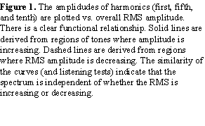 Although the rate and direction of amplitude change seem to be of no consequence, there is quite a lot of variation among the curves in Figure 1, especially in the higher harmonics and lower amplitudes. There could be other factors at work systematically, or these could be random variations. Listening tests indicate that amplitude and frequency alone are sufficient to produce realistic trumpet tones.