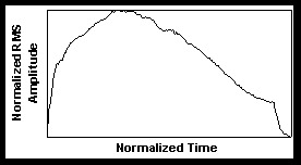Figure 1 shows a typical trumpet envelope taken from a sequence of tongued quarter notes. This shape can be interpreted based upon some simple elements of trumpet performance. First, the overall arch shape can be attributed to air pressure in the lungs. Since the regulation of this air pressure involves most of the torso, it should not be surprising to find a smooth overall shape as opposed to a rapidly modulated one. The rapid rise is due to the tongue, which acts as a valve in releasing air. As expected, there is much less of this seen in slurred note transitions. We were surprised to see a relatively fast release, almost like that caused by a damper on a piano string, at the end of tongued notes. This can be explained as the effect of stopping air with the tongue in preparation for the next note. In fact, this "damping" feature is not found on notes that are not immediately followed by a tongued note, and it does not appear in classical analyses of the trumpet such as the one by Moorer, Grey, and Strawn (1978).