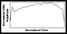 I 4 tones were manually extracted and analyzed. Since we were already performing spectral analyses with the phase vocoder in the SNDAN program (Beauchamp 1993), we used the RMS amplitude output of SNDAN, normalized to a maximum amplitude of 1, for our envelope data. Each envelope was automatically trimmed, starting when the AI 4 initially crossed a threshold of 0.1 and ending when the subsequent note crossed a threshold of 0.1. The envelopes were then normalized to a duration of 1.0. A total of 125 contours were recorded, varying in interval size, direction, and articulation. 67 of these were performed mezzo forte with "normal" articulation.The center of mass or first moment of each envelope was calculated according to: