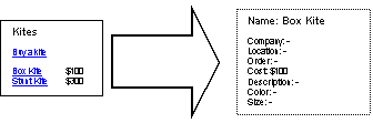 Figure 1 shows a theoretical web site from which product information needs to be extracted. The relevant fields to extract include: Product name, company location, order contact, cost, description, and specific specification fields. The common information extraction task is to correctly identify and label each of these fields. The next step is to correctly group the fields into the records displayed on the left of Figure 1. Since the required fields are scattered across multiple pages grouping the fields becomes a non-trivial problem. For example the company location must be shared with all records extracted from the site. The sales phone number for purchasing kites is different than one for ordering other products and so it must only be grouped with kite records. The product price is not found on the page that contains the main product information, but on the one that links to it. Finally, the detailed specifications are on a secondary page.