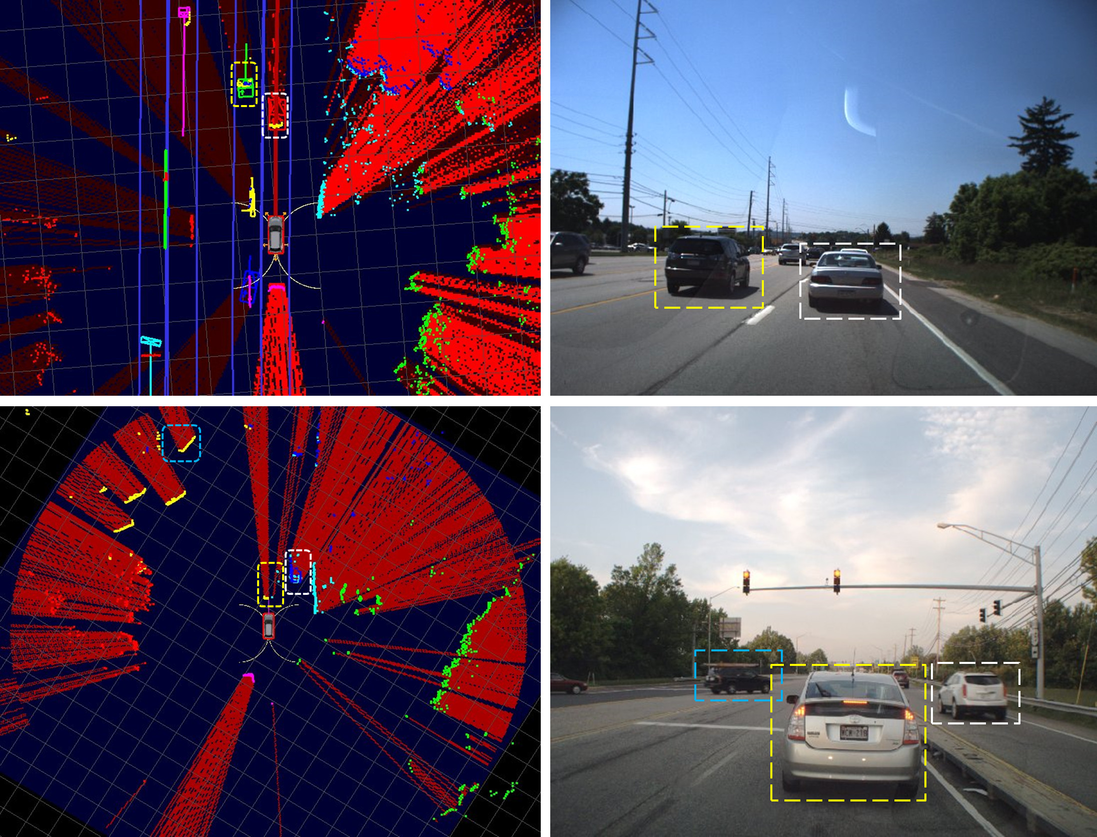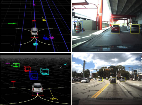 As a self-driving car is intended to interact with other road occupants (e.g., cars, pedestrians, bicyclists, etc.), knowledge of these objects is a critical piece of information that a self-driving car must reliably and timely maintain. This work aims at developing a new system for detecting and tracking of moving objects that extends and improves the capabilities of our earlier system used for the 2007 DARPA Urban Challenge. In particular, we revised our earlier motion and observation models for active sensors and incorporated measurements from a vision sensor. The vision module detects pedestrians, bicyclists, and vehicles to generate corresponding vision targets. Our new system exploits these visual detection results to improve our earlier methods on tracking model selection, data association, and movement classification. With the data log of actual city and inter-city drivings, we demonstrated the improvement and performance gain of our new system. Hyunggi Cho, Young-Woo Seo, B.V.K. Vijaya Kumar, and Raj Rajkumar, A multi-sensor fusion system for moving object detection and tracking in urban driving environments, In Proceedings of the IEEE International Conference on Robotics and Automation (ICRA-2014), pp. 1836-1843, Hong Kong, China, 2014. [10.1109/ICRA.2014.6907100] |
