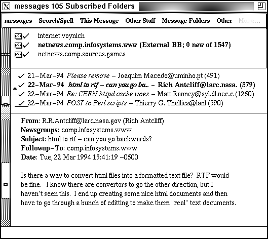 The messages window is divided into three sections: a folder area, a caption area, and a body area. The folder region contains a listing of different mail and bulletin board folders. The caption area shows you the date, subject and sender of messages from the folder you've selected, and the body area displays the message you want to read.