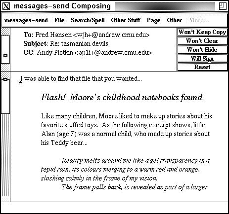 Messages is fully compatible with the MIME standard for multimedia mail. MIME messages will be displayed fully formatted, using AUIS's formatted text inset (and whatever other media insets are needed.) You can also compose messages using the AUIS text editor; the message will be sent in MIME format.