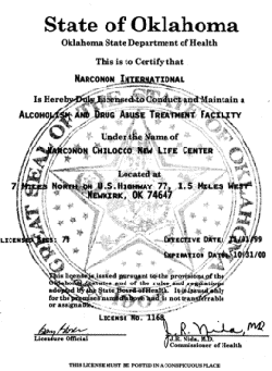 State Licensing: Narconon® Chilocco New Life Center has always worked closely with local authorities to maintain appropriate licensing. The State of Oklahoma licenses Narconon Chilocco to operate a 75-bed residential drug and alcohol treatment facility.