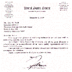 Commendations from Government Officials: “It is my personal pleasure to send congratulations to you and your staff on maintaining accreditations with CARF. As a United States Senator for Oklahoma, one of my great pleasures is acknowledging the accomplishments of our state’s quality organizations and those involved in it’s functions. I am sure that a lot of time and effort by you and your staff made it possible to accomplish this milestone. Again, congratulations to all of you on a job well done.” James M. Inhofe