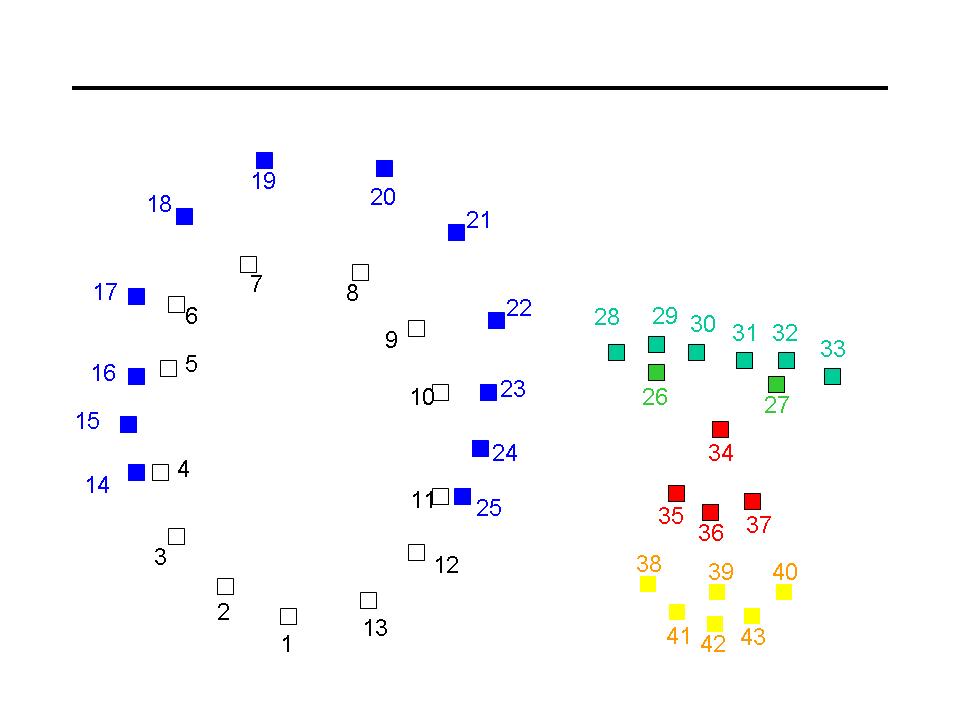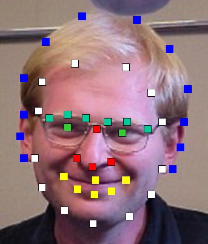 Several fun things are possible with our new morpher. For example, we can compute the mean face of 15-463 students. This would involve: 1) computing the average shape, 2) warping all faces into that shape, and 3) averaging the colors together. However, this would also require a consistent labeling of all the faces. So, what we will do is ask everyone to label their own face (and maybe a few others of their own choosing), but do it in a consistent manner as shown in the following two images: points, point_labels. For each face image, you should put on your website a text file with coordinates of x,y positions, one per line (43 lines total). Please name the file with the same name as your picture, but with a ".txt" extension. You can read/write such files with the save -ascii and load -ascii commands. If everyone does this in a timely manner, then everyone can use all of the data to compute their mean image. Show the mean image that you got, as well as 1) your face warped into the average geometry, and 2) the average face warped into your geometry. To get you started, here are the faces and points from previous years.