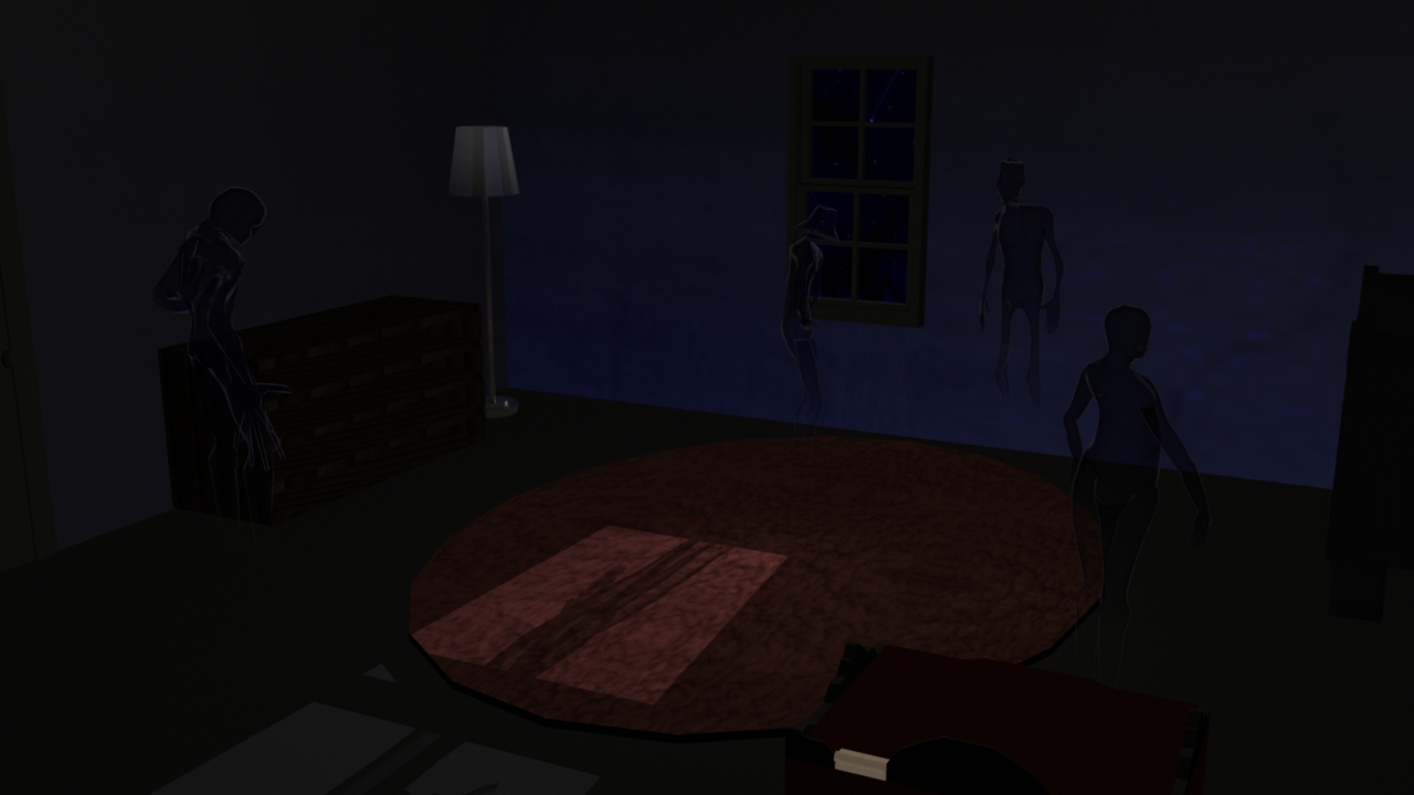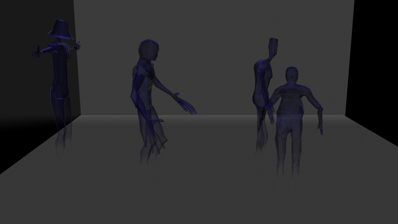 We tried out a number of different things with rendering the shadows. For sake of simplicity, we decided to use a complex maya shader network that takes into account the camera position, height-mapping, and several different textures to render each shadow. Below are one of the biggest decisions we had to make: whether to make shadows' feet completely disappear or have it be 2-dimensional