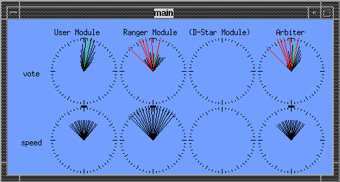 Each path evaluation consists of a steering angle, value, and speed. If the value is "veto" (= red) then that steering angle is eliminated from consideration. Otherwise, recommendations for that steering angle from all sources are combined using a weighted sum. The arbiter then finds the largest contiguous set of steering angles whose values are all within 90% of the maximum value, and chooses the midpoint of that set as the commanded steering angle (= green) to be sent to the controller module (the speed chosen is the minimum speed recommended by all the sources). The idea is to prefer wide, easily traversable areas over directions that might be a bit more traversable, but have less leeway for error if the rover fails to track the path precisely. We have found this to be very important in practice, as the robot's dead reckoning and path tracking ability are only fair, at best.