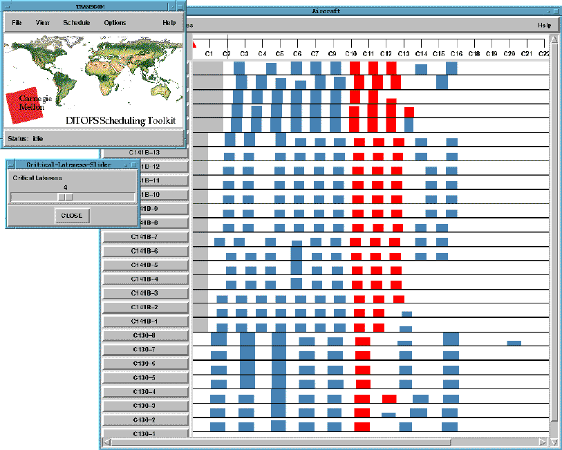 Due to the configurability of DITOPS/OZONE it is easy to integrate it or parts of its functionality with other planning systems. In an early technology integration experiment (TIE) with SRI, DITOPS was used to perform resource capacity analysis for higher level course of action planning by integrating it with SRI's SOCAP planner running on the Common Prototyping Environment (CPE) developed by BBN. Some DITOPS functionality was also embedded into BBN's TARGET mission planning system to perform feasibility checking and conflict diagnosis of course of action plans. More recently the OZONE class library has been applied to develop a prototype system for aero-medical evacutation (re)planning. The current version of DITOPS runs on a Sun Sparcstation. A more portable version, aimed additionally at PC and Mac platforms and utilizing a Java-based interface is nearing completion. Interaction with the user takes place through a direct-manipulation user-interface which is centered around Gantt-diagrams of resource capacity usage (see Figure 1). In comparison to conventionally used simulation approaches to producing schedules for large-scale deployment problems, we have demonstrated that DITOPS is able to efficiently generate higher quality schedules while simultaneously satisfying a wider range of deployment constraints. For example, DITOPS is currently capable of generating a detailed 3000-movement TPFDD (Time-Phased Force Deployment Data) schedule in about 6 minutes (on a Sparcstation 10). Current efforts are extending and adapting the OZONE/DITOPS framework for application in two different scheduling domains: