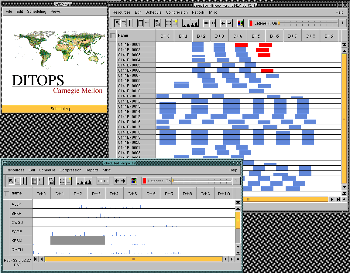 In collaboration with Maya Design Group, we have developed an initial vision of such a collaborative scheduling environment. "Ditops-Visage" is an advanced system for development and management of complex transportation schedules. Users utilize advanced data exploration and visualization tools (Visage) to interpret scheduler results, assess implications with respect to other, external data sources and planning perspectives, and to focus (re)scheduling actions. An incremental reactive scheduler (Ditops) provides flexible schedule revision and (re)optimization capabilities for responding to user inputs. A demonstration of the integrated Ditops-Visage prototype showing a deployment re-planning scenario has been developed for DARPA's JFACC program.