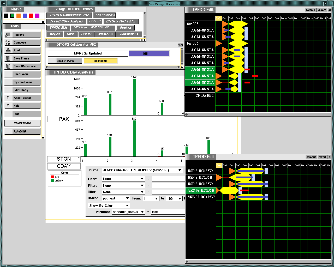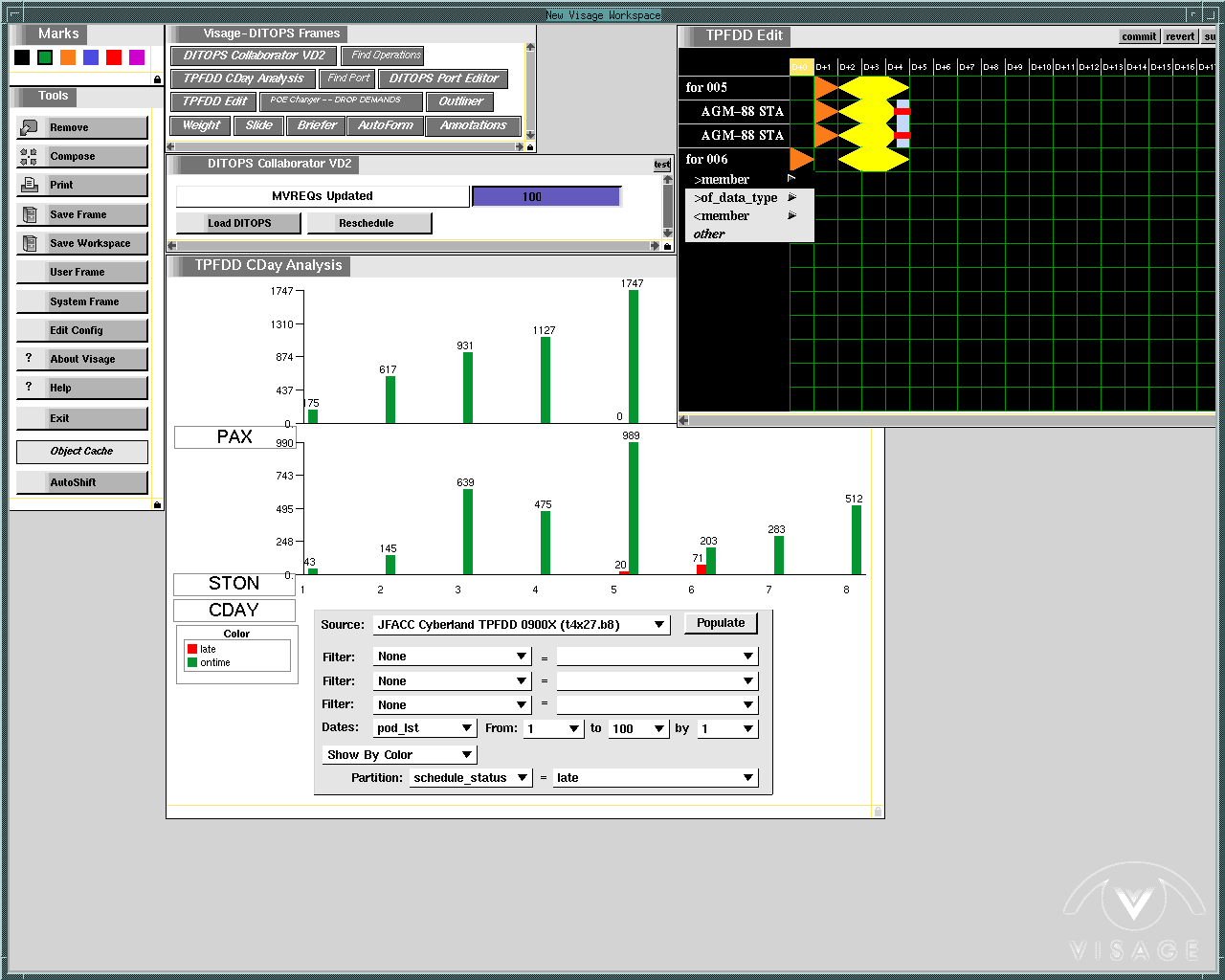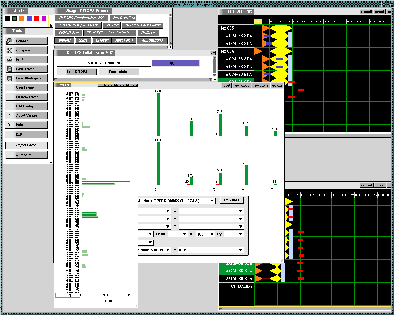 Figure 10: We tear-off a "TPFDD Edit" frame, and drag-and-drop the late cargo into it (i.e., we drag-and-drop the red vertical-bars). The late cargo appears in the new frame as the strings "for 005" and "for 006" (i.e., the late cargo that is arriving on days D+5 and D+6). Then, we drill-down into the members of these "aggregates", in order to identify the individual move-requirements that are late.