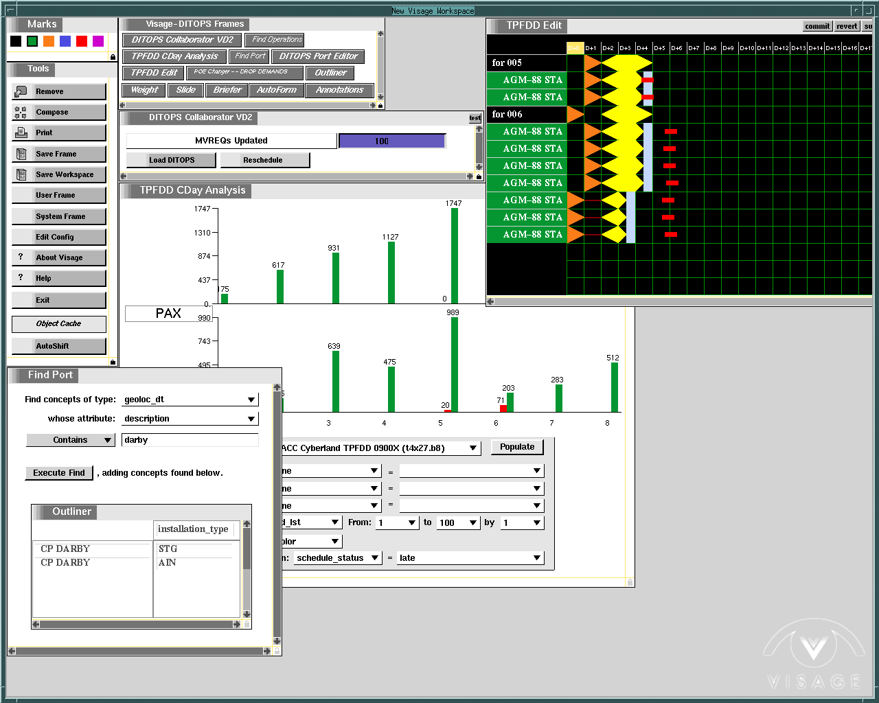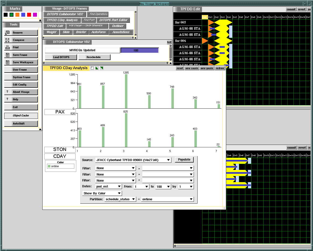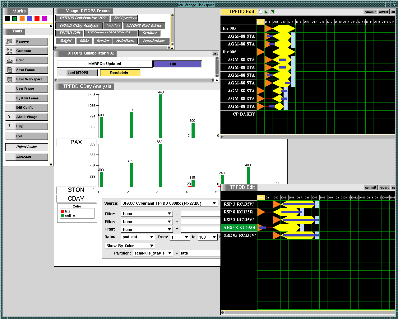 Figure 10: We tear-off a "TPFDD Edit" frame, and drag-and-drop the late cargo into it (i.e., we drag-and-drop the red vertical-bars). The late cargo appears in the new frame as the strings "for 005" and "for 006" (i.e., the late cargo that is arriving on days D+5 and D+6). Then, we drill-down into the members of these "aggregates", in order to identify the individual move-requirements that are late.