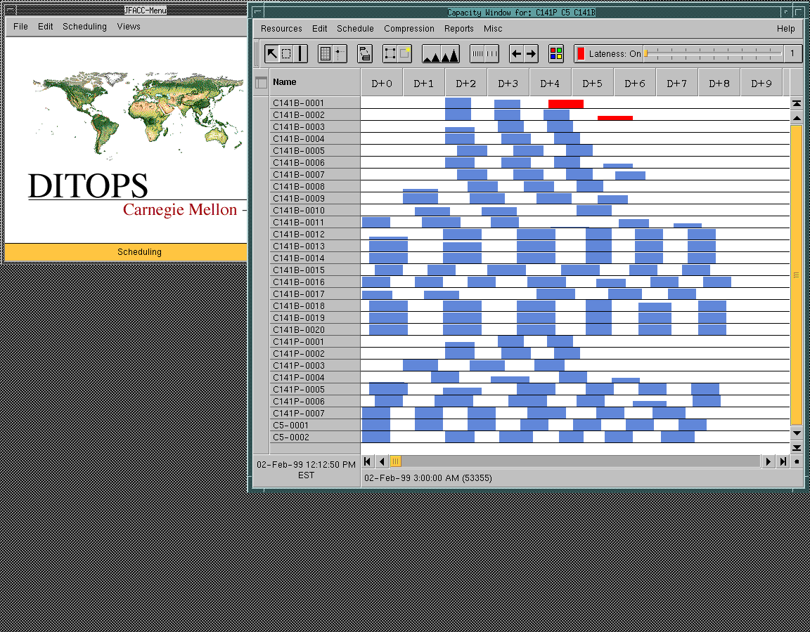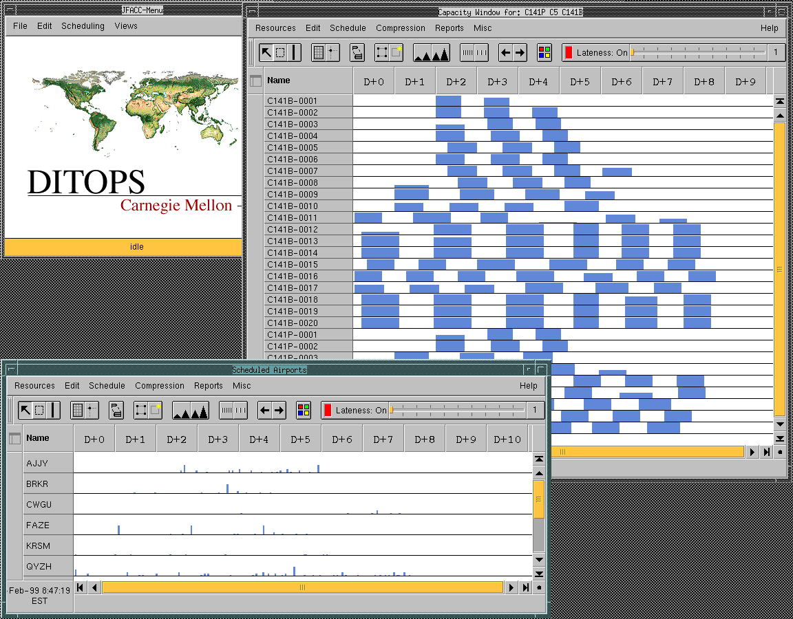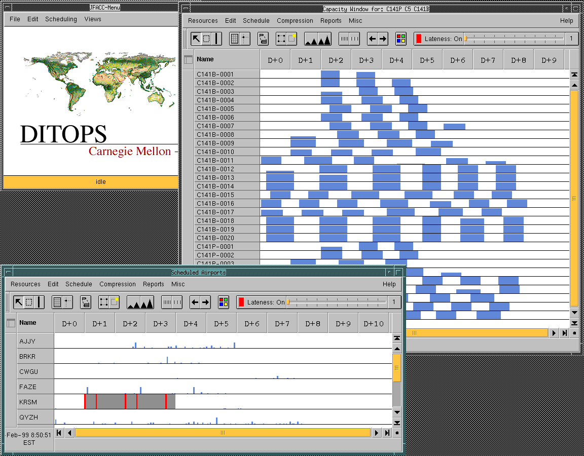 Figure 8: We see the result of the rescheduling. The 5 red stripes have disappeared from the airport utilization graph...the airport conflicts have been resolved. However, because of the delays involved, some of the cargo that is being moved on these flights is now scheduled to arrive late, as indicated by the red bars in the DITOPS flight schedule.