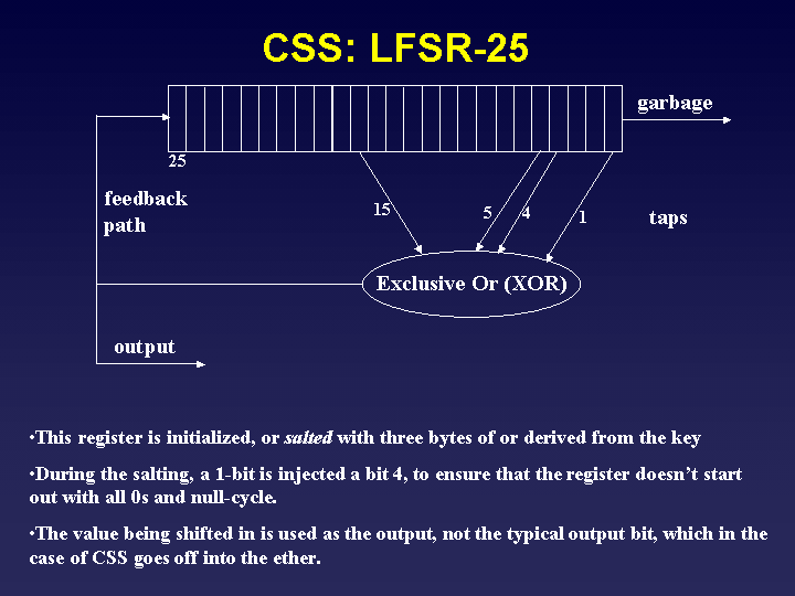 As we'll discuss shortly, CSS is based on two Linear Feedback Shift Registers (LFSRs). Although very efficient in hardware, LFSRs are somewhat inefficient to implement in software, and there are some interesting programming techniques that are used to speed up the process. Unfortunately, I do not believe it is lawful for me to show that code, or equivalent code, to you today -- for that reason, I will not. Unfortunately, the same concern leads me to suggest that you refrain from reviewing the DeCSS source code after this lecture. Unlike my suggestion to review an implementation of DES, obtaining source code for DeCSS may well violate federal law. So today, you will literally get, "As much of an education as the law allows -- and no more."