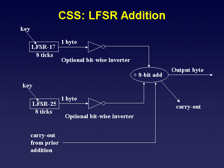 Invert Output of LFSR? Mode LFSR-17 LFSR-25 Authentication Yes No Session Key No No Title Key No Yes Data Yes No The slide below shows the process, including the LFSRs, inverters, and addition. Please remember that each inverter is only enabled in those modes noted as "yes" in the table above: