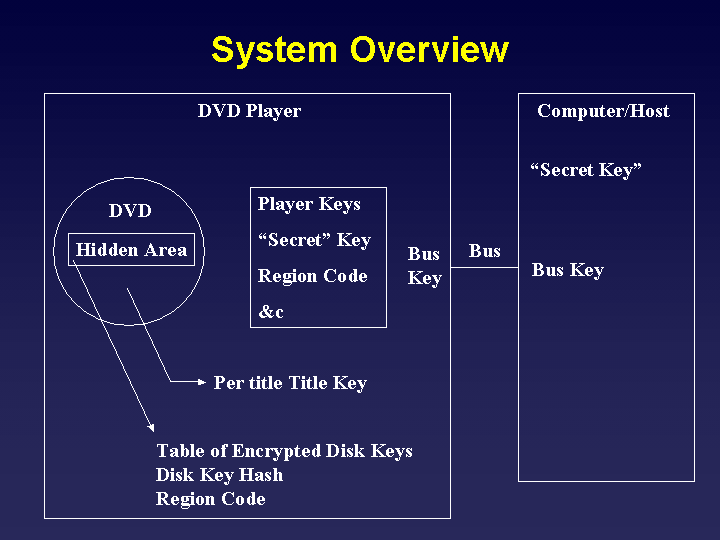 The DVD disk itself contains the encrypted content, as well as a hidden area. It is my understanding that commerciallyt writeable DVDs already have this area marked, so that they cannot write to it. The contents of this hidden area cannot be delivered, except to an authenticated device. Presumedly, any device which can authenticate has been licensed by the DVD Copy Control Association, and as a consequence is trusted to receive the information. This hidden area contains the several pieces of information that we will soon discuss: a table of encrypted disk keys, and an encrypted disk key (disk key hash).