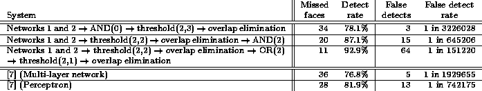 Table 3 shows the accuracy of their system on Test Set B, along with the results of our system using the heuristics employed by Systems 10, 11, and 12 in Table 1. In [7], 149 faces were labelled in the test set, while we labelled 155. Some of these faces are difficult for either system to detect. Based on the assumption that [7] were unable to detect any of the six additional faces we labelled, the number of missed faces is six more than the values listed in their paper. It should be noted that because of implementation details, [7] process a slightly smaller number of windows over the entire test set; this is taken into account when computing the false detection rates. Table 3 shows that for equal numbers of false detections, we can achieve higher detection rates.