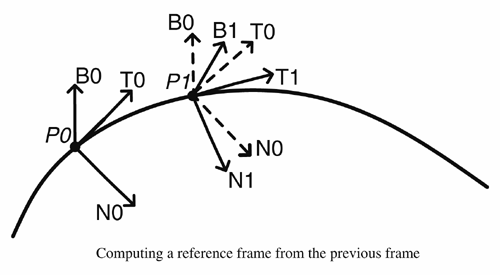 Sloan's method decides each coordinate system using a function of the previous one, to ensure continuity. There are three vectors that we care about for each position P along the length of the spline—these are the tangent, the normal, and the binormal (or T, N, and B). The tangent is already known at each position—it can be acquired from the derivative of your spline function. The vectors which must be decided by this method are N and B.