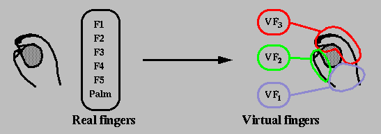 real fingers that are touching the object (i.e., "active") to virtual fingers.