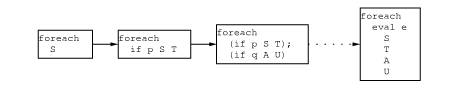 psForeach loops over a statement; eval recursively switches over several statements. The leftmost box