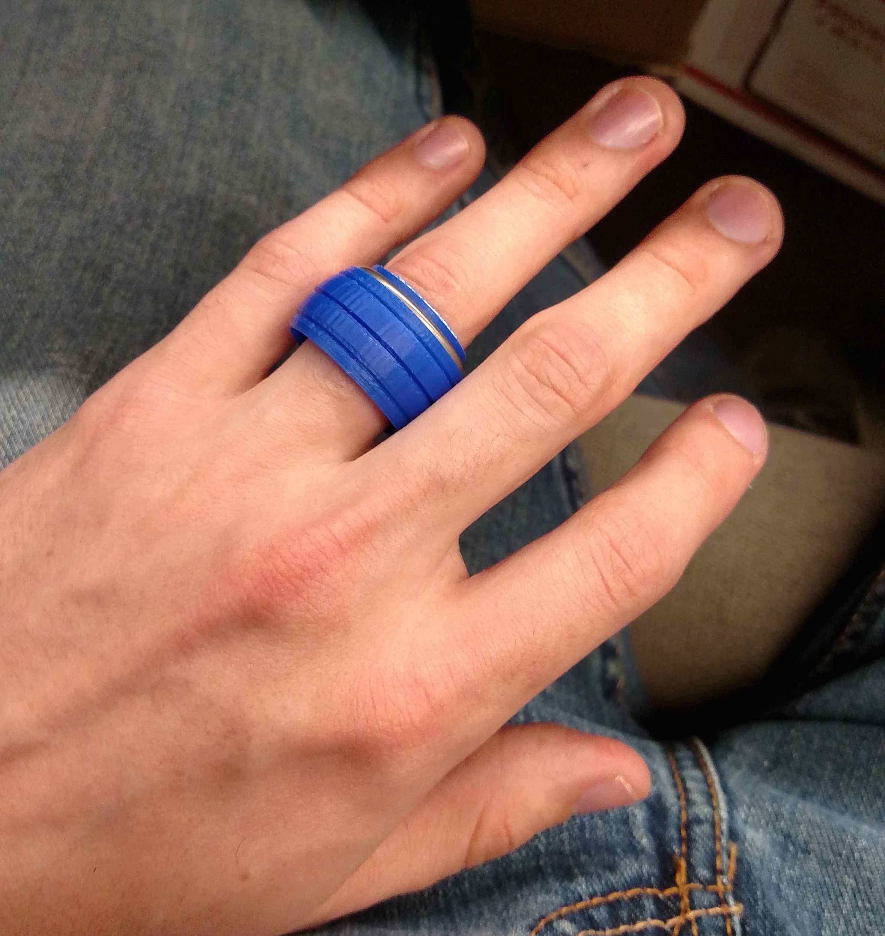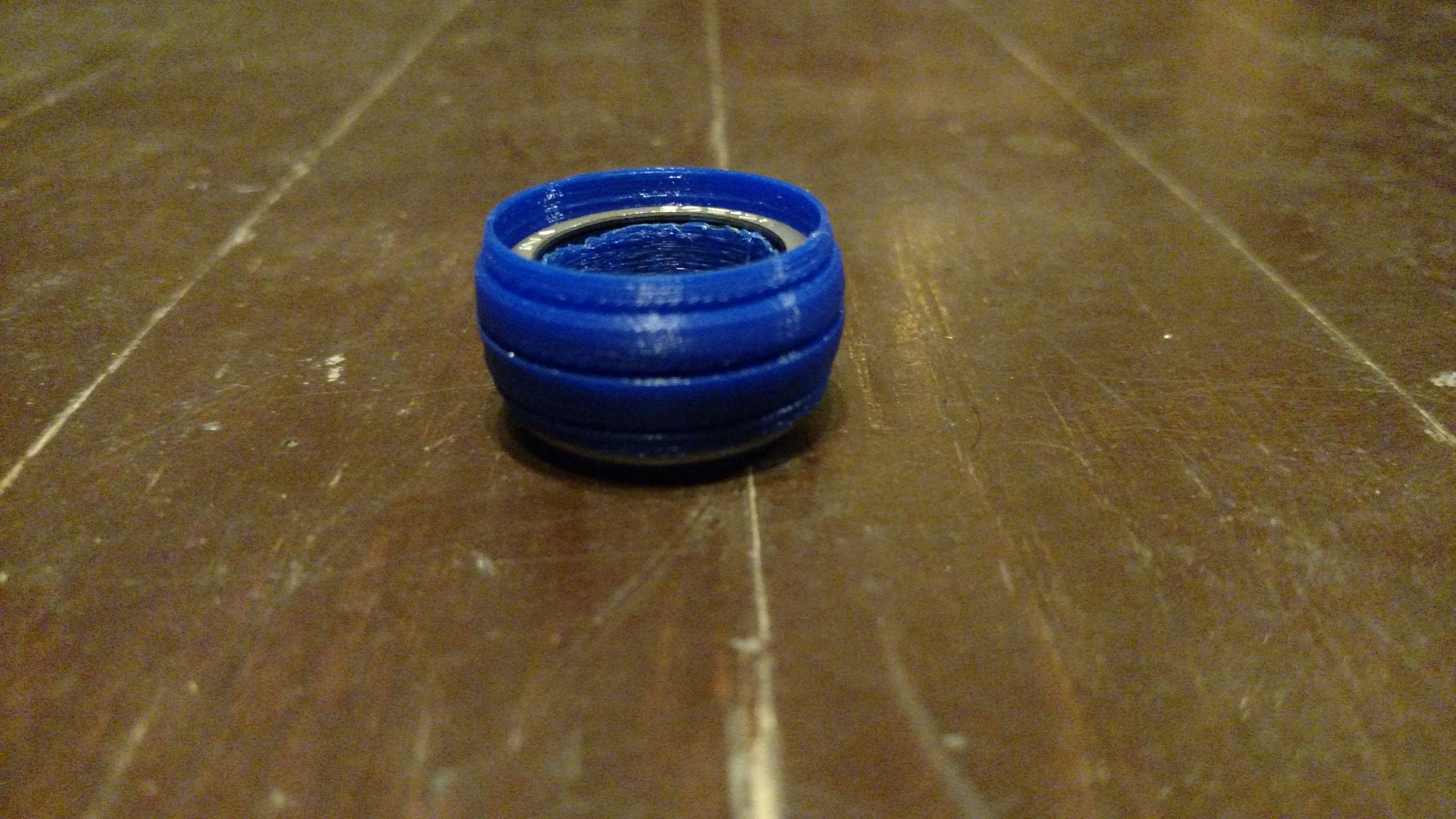 This spinning ring is anything but a simple, every day ring. Sizing with 3D printers can always be problematic and that was the first challenge of this ring's design. After finding out the right dimensions to get a good press-fit on the roller bearing, the chosen ring design was split in half. The first part fits inside the bearing to press against the rollers and to go over the ring finger, and the second half goes around the outside of the roller bearing to make the outside of the ring.