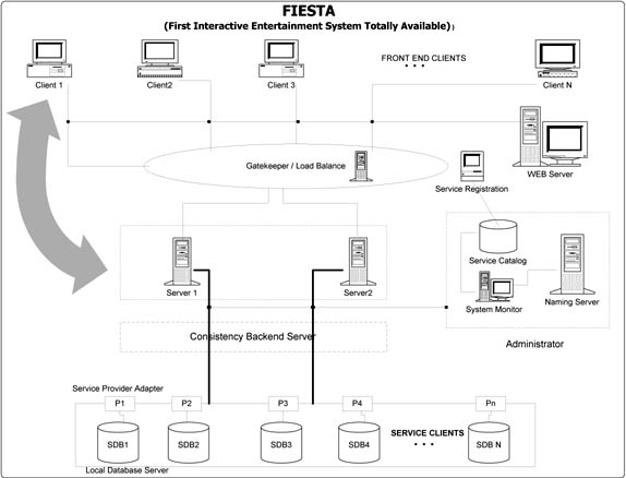 Figure #1 is the architecture for FIESTA. FIESTA consists of the following modules: the Front-End Client and the Web Server, the Gatekeeper, FIESTA Servers, Administrator Module, the Back-End Consistency Server and the Service Client (Service Provider Adapters and Databases). The remaining of the proposal describes each module in brief. Front-End Client Web Server A Front-End Client is any user that accesses the FIESTA Web Server in order to engage in a permissible transaction such as making restaurant reservations, viewing restaurant/theatre information (menu, type of cuisine, location) and purchasing theatre tickets. The back-end modules (FIESTA Servers and Service Client Databases) handle the details of the transaction. As shown in Fig. #2, the information flow between the front-end modules (Client and the Web Server) is as follows: