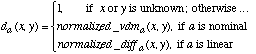 (8)In the section on HVDM, the distance between input vectors was defined as the square root of the sum of the squares of the individual attribute distances, each of which could be a linear distance (for continuous attributes) or a VDM distance (for discrete attributes):