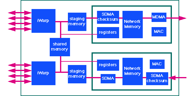 internal interconnect of iWarp through the links on the left, and the green blocks correspond to the CAB. We have observed rates of 450 Mbit/second from a