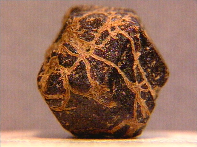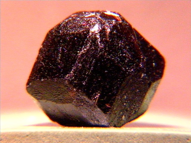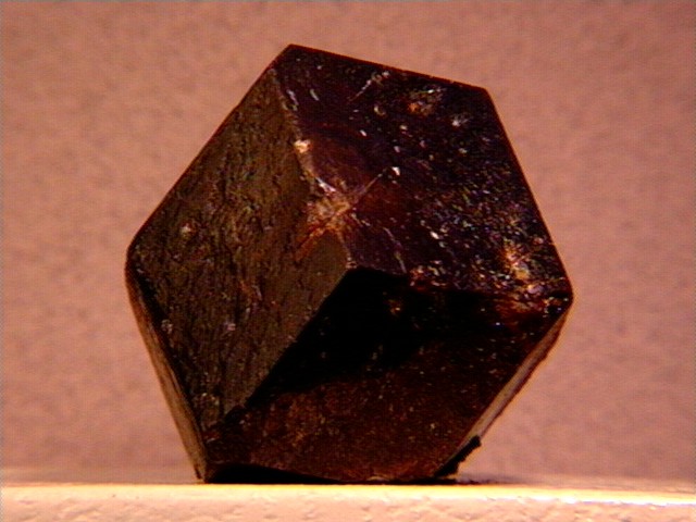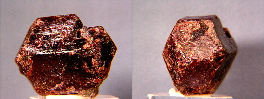 A nearly opaque, dark purplish-red almandine from Mt. Lemmon, Arizona. The facets are a combination of both rhombdodecahedral and icosatetrahedron forms. This was one of the first garnets in my collection. | |