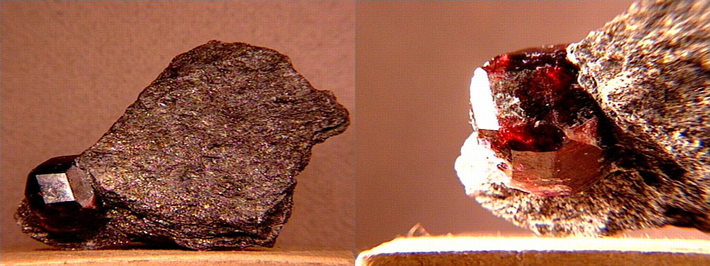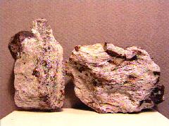 Two pieces of almandine schist from Roxbury, New Haven County, Connecticut - the one on the right has some staurolite crystals as well. Thanks to Leslie Shelby's auction on eBay for the specimen! | |