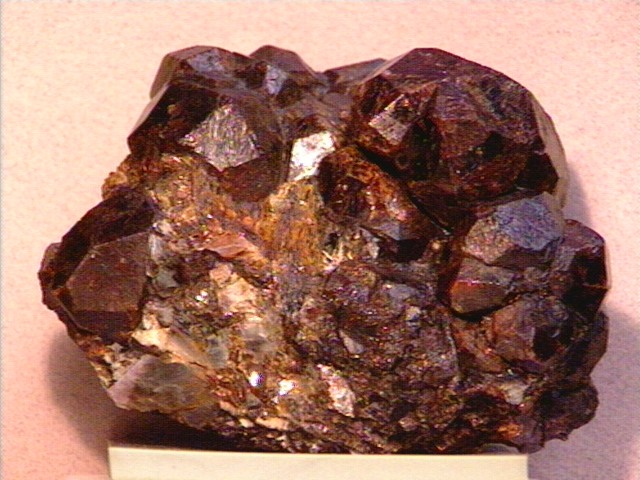 A cluster of very dark red almandines with light green epidote-included quartz from the Marmoraton Iron Mine in Marmora Township, Hastings County, Ontario, Canada. Though sold as almandine, similar garnets from here have been analyzed (George Robinson, MinRec,V13 #2, pp. 73 - 75) and found to be andradite-grossulars. Thanks to Dean Bessey's auction on eBay for the specimen! Thanks also to Reiner Mielke for the species and association update! | |