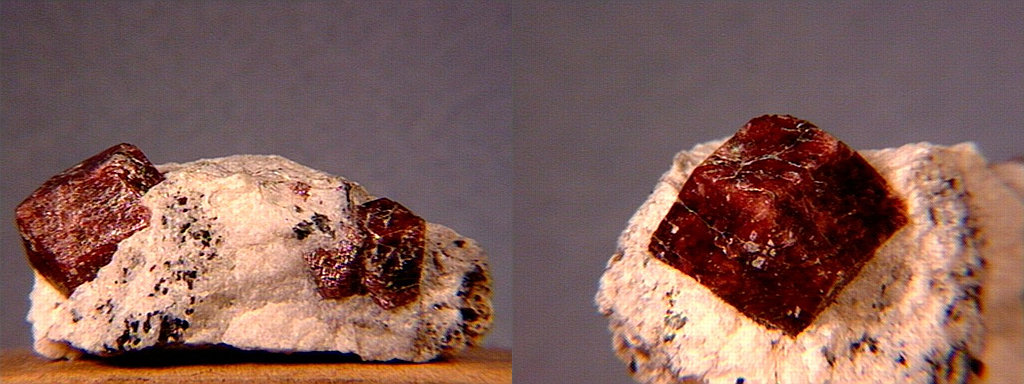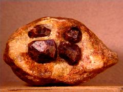 These dark red almandines on an orthoclase matrix are from Mexico. Thanks to Greg Ferdock at Gem Finders International for the specimen and the image! |