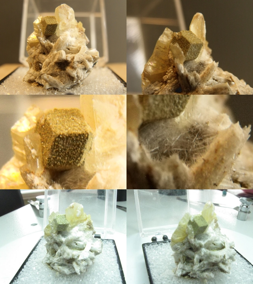 A gorgeous miniature of gemmy demantoids on a white fibrous amphibole matrix from the 2009 find at the Jeffrey mine, Asbestos, Les Sources RCM, Estrie, Québec, Canada. Thanks to Mike Petrov's auction on eBay for the specimen and the images! | |