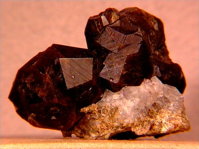 A sharp, very dark red-brown andradite on matrix from the Miracle Mountain Mine, Garnet Hill, Calaveras Co., California. Thanks to Tom Lettier and Ken Balthazor's (The California Crystal Connection) auction on eBay for the specimen! |