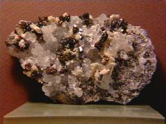 Dolomite, Galena, Pyrite, and Sphalerite This was a tough one both to photograph and to decide how to classify it. There's also octahedral galena, quartz, pyrite, and black sphalerite. It comes from the now-closed Homestake Mine in Lead, Lawrence County, South Dakota. Thanks to Tom & Vicki Loomis at Dakota Matrix Minerals for the specimen! |