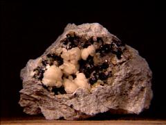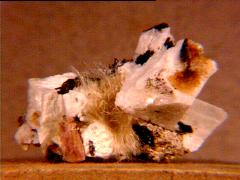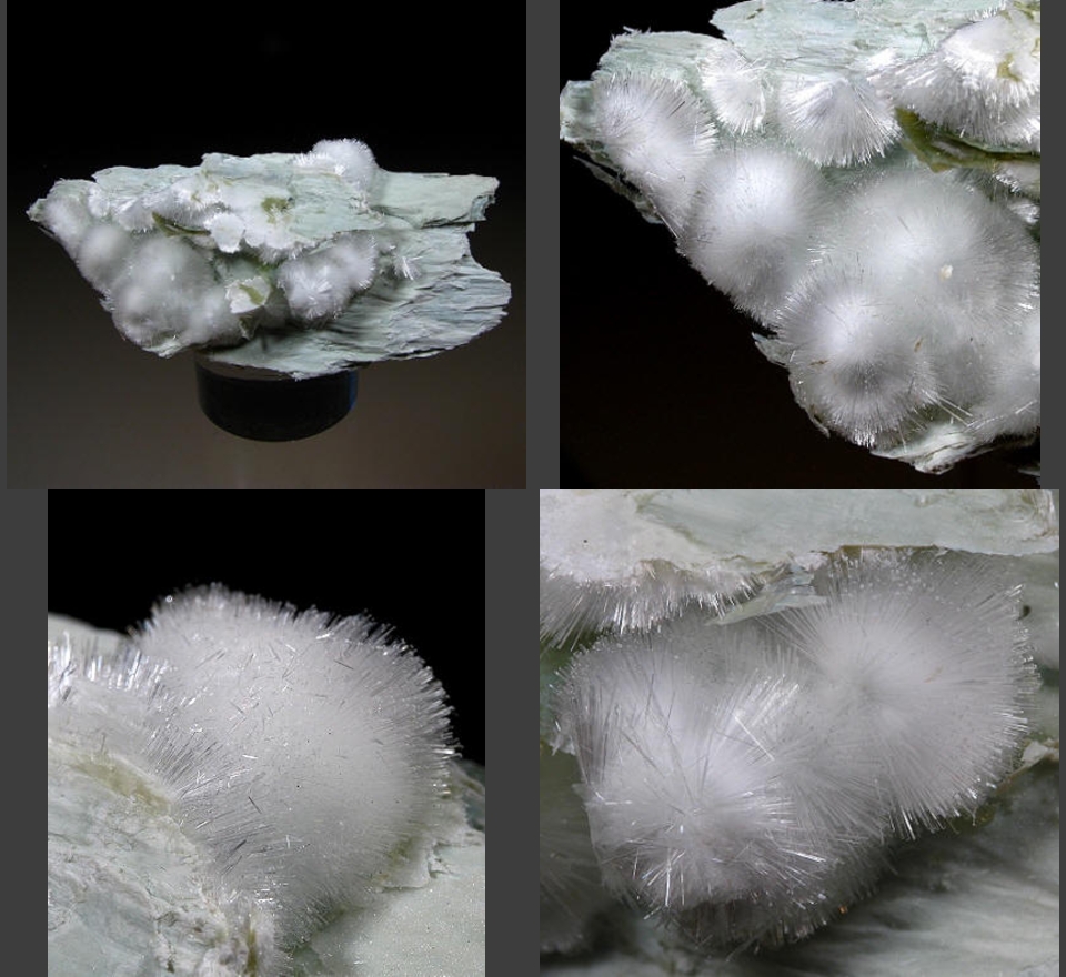 This is a beautiful small cabinet specimen of white radial dawsonite (an aluminum sodium hydroxycarbonate) on matrix from Tenés, Algeria. It has an old J. Bardet label. Thanks to Thomas Bee's auction on eBay for the specimen and the images! | |