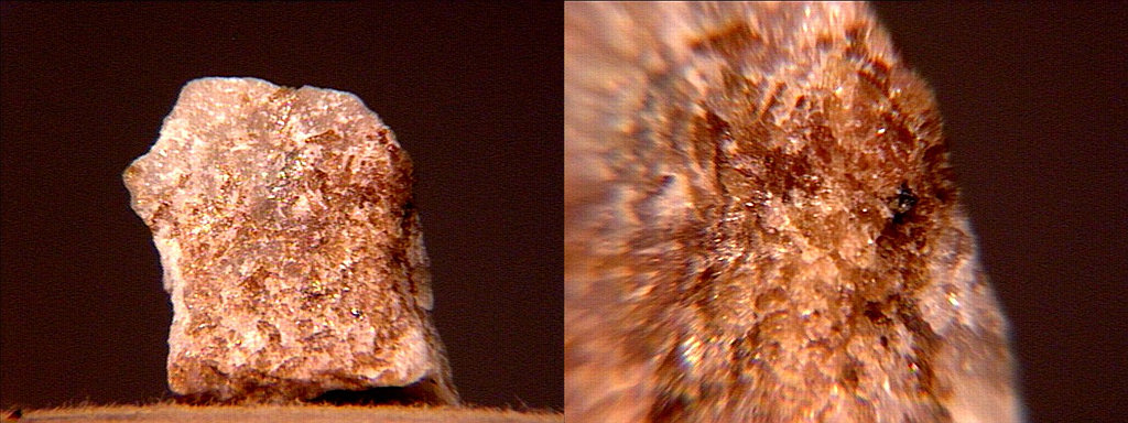 A micro (core sample) of white giorgiosite (a hydrated magnesium hydroxycarbonate) from the Korshunovskoye deposit, Irkutsk, Eastern-Siberia, Russia. The water of hydration varies from 4 - 6 molecules and the mineral is "inadequately described" according to MinDat, but this particular sample was analysed by both SEM / EDS and XRD. Thanks to Csanad Loranth's auction on eBay for the specimen and the images! |