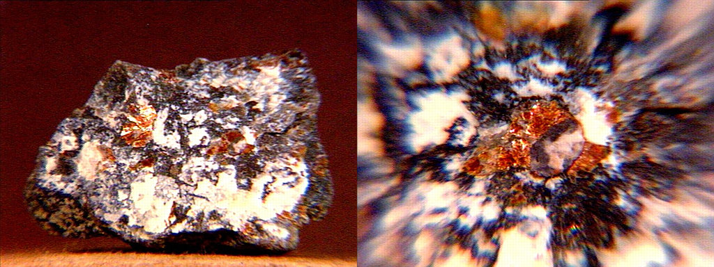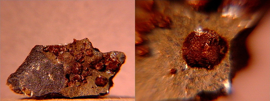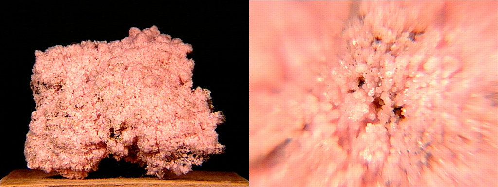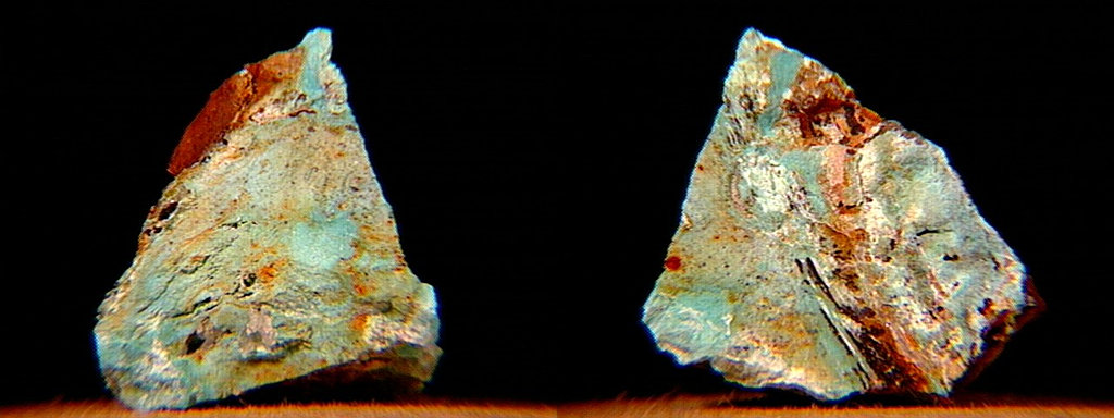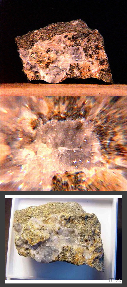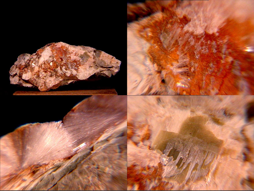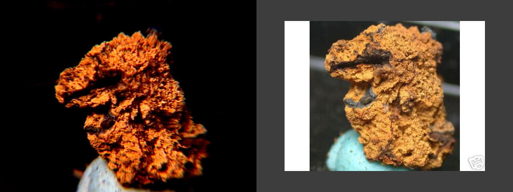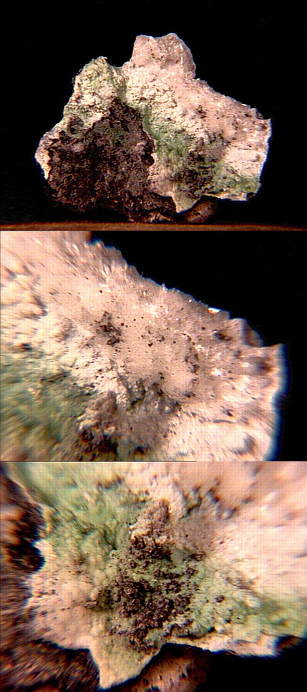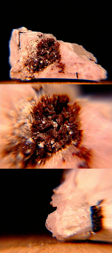 A micro of sphaerocobaltite (cobalt carbonate, IMA spelling spherocobaltite) and heterogenite (cobalt oxyhydroxide) from Mount Cobalt, Selwyn Ranch, Queensland, Australia. These may well be true sphaerocobaltite and heterogenite - most of what's on the market is either cobaltoan dolomite from the Congo or more recently (2003) cobaltoan calcite from Morocco; likewise, most Congo-associated heterogenite is oxidized chrysocolla. Thanks to Chris Auer's (Eureka Micromounts) auction on eBay for the specimen and the image! |