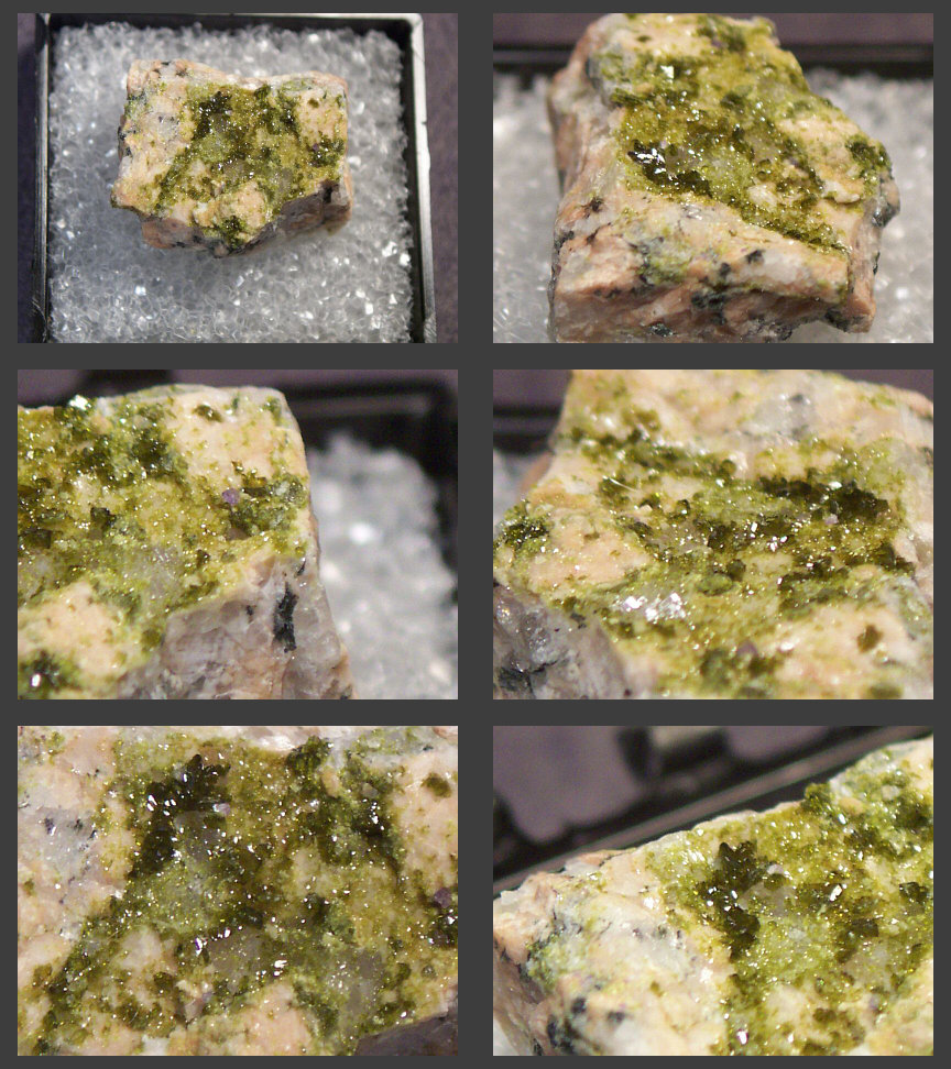 This beautiful miniature of green siderite, quartz, and marcasite is deaccessioned from the collection of Neil Prenn - it dates back to the 70s and is from the Morro Velho Mine in Nova Lima, Minas Gerais, Brazil. The larger image (bottom row, right) shows some millimeter-sized pyrrhotite crystals. Thanks to C. Jones' (Geoprime Minerals) auction on eBay for the specimen and the image! | |