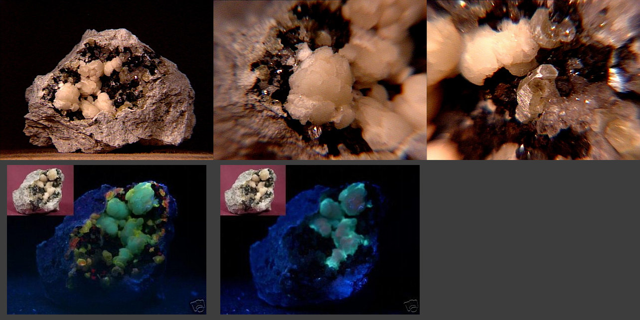 An excellent miniature of spherical dresserite (hydrated barium aluminum hydroxycarbonate), hexagonal weloganite prisms, and calcite on matrix from the type locality of the Francon Quarry, Montréal, Québec, Canada. The larger image shows the association under SUV (bottom left) and LUV (bottom right). Thanks to Nicole Gariepy's auction on eBay for the specimen and the fluorescence images! | |