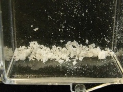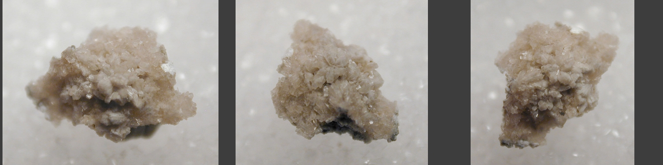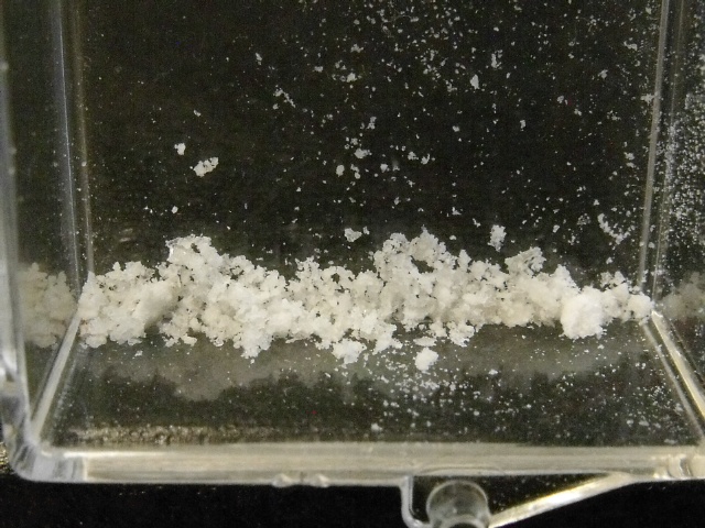 A gathering of white thermonatrite (sodium carbonate monohydrate) particles from Kern County, California. Thanks to Kristen Burgess' auction on eBay for the specimen! |