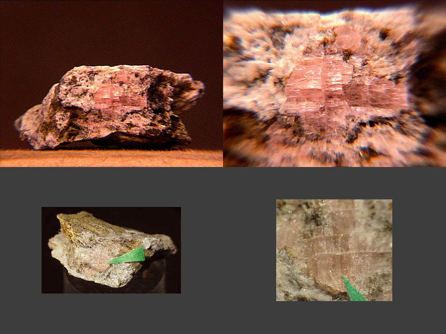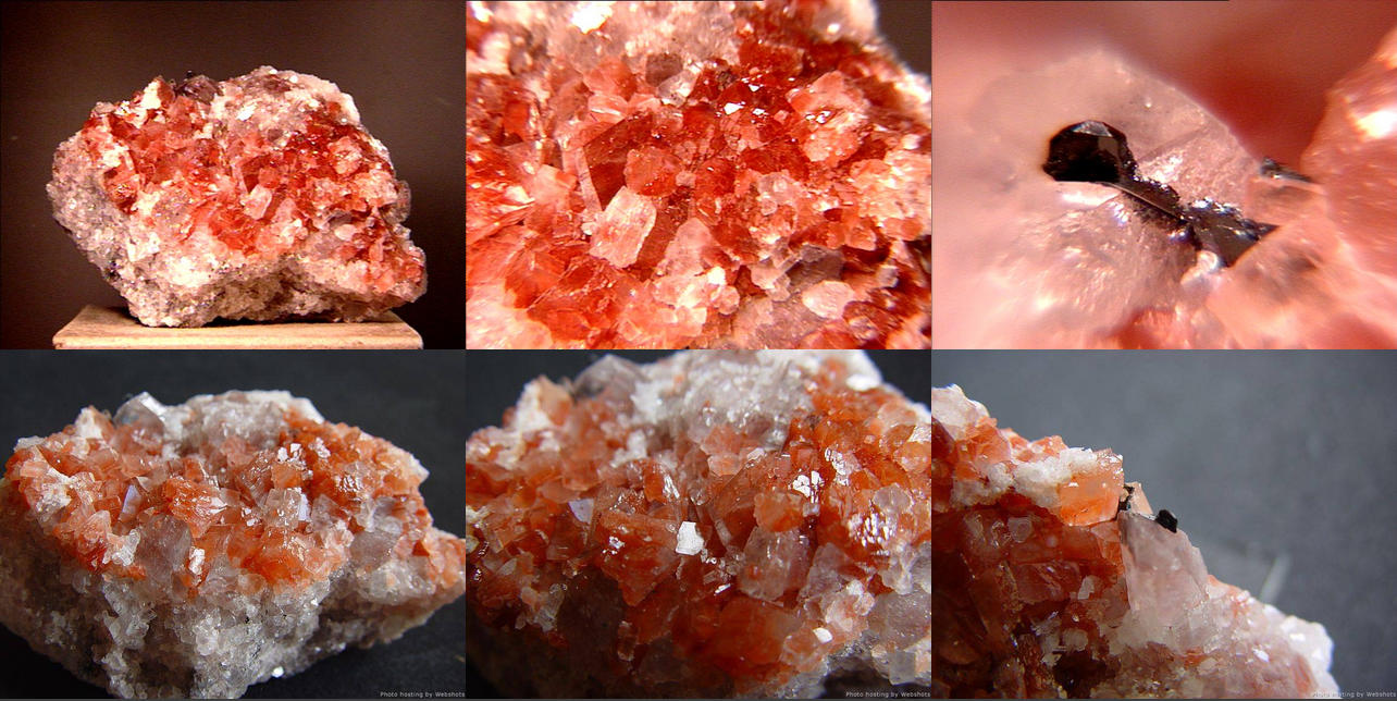 Kutnohorite (kutnahorite) is essentially calcium-rich rhodochrosite. It forms a series with both dolomite and ankerite. This thumbnail from the N'Chwanning Mine in the Kalahari Manganese Fields of South Africa is interesting under low light conditions (larger image, bottom row) - the kutnohorite habit appears to gather the light at the surface! Thanks to Craig Ackermann's (KalahariMinerals.com) auction on eBay for the specimen! | |