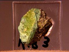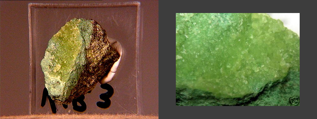 This thumbnail of massive takovite, a hydrated nickel aluminum hydroxycarbonate, comes from the find in Spring 2001 in Laurion, Attiki, Greece. Thanks to Chris Auer's (Eureka Micromounts) auction on eBay for the specimen! |