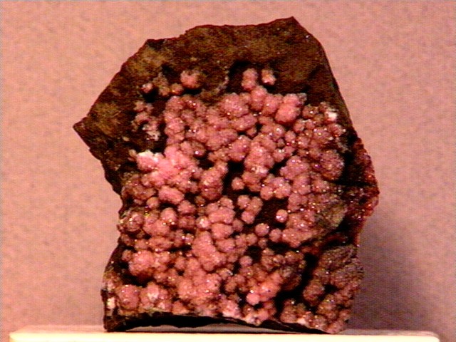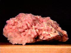 Rhodochrosite is manganese carbonate, thus the pink color. Sometimes it occurs in reddish-pink facetable crystals, but more often, like here in this miniature from Argentina, it's in a massive, encrusted habit. It's a minor ore of manganese. |