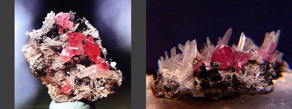 Rhodochrosite crystals and a cluster of quartz from Peru. Thanks to Chris Korpi at Pangaea Minerals for the specimen! |