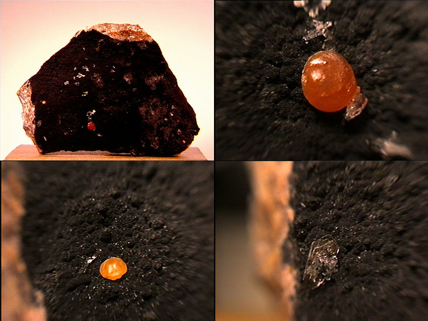A beautiful small cabinet specimen of bright orange magnesite with a few crystals of specular hematite (larger image, right) onm matrix, also from Brumado. The Thanks to Lourenço Santos' auction on eBay for the specimen and the images! | |