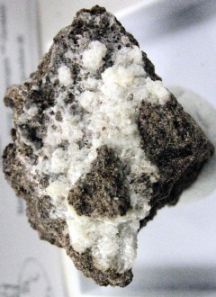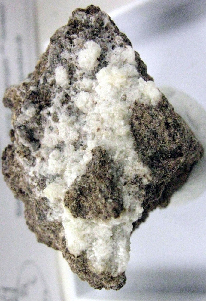 A large micro of white, microcrystalline teschemacherite (ammonium bicarbonate) and salammoniac (ammonium chloride) on matrix from the guano mine at Pabellón de Pica, Chanabaya, Iquique Province, Tarapacá Region, Chile. It has Mineral Zone and Gunnar Farber Mineralien tags. Despite this specimen's provenance, note that MinDat shows no Chilean teschemacherite deposits. Thanks to David H. Garske's auction on eBay for the specimen and the image! |